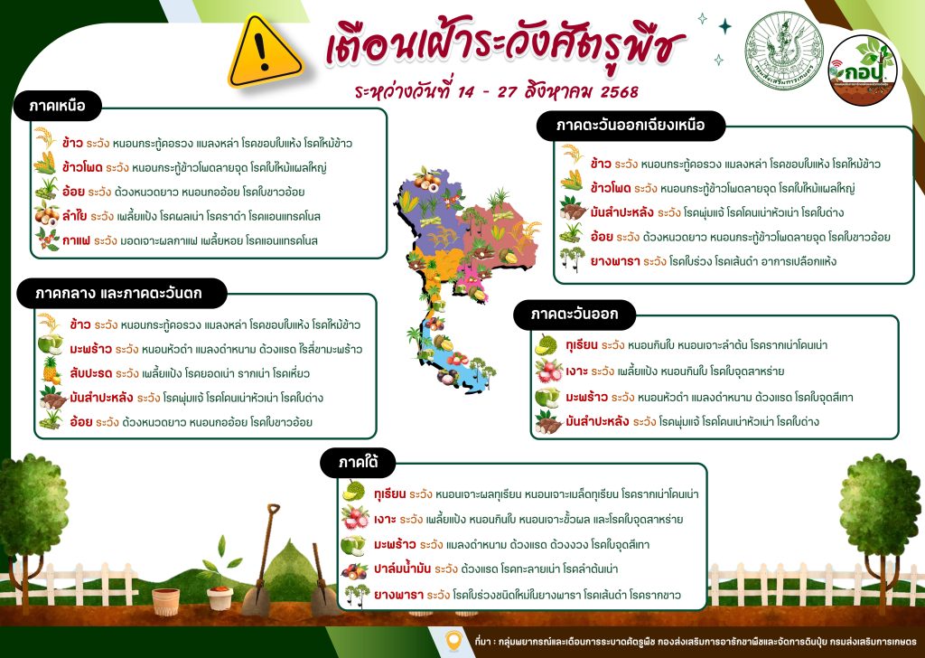 เตือนเฝ้าระวังศัตรูพืชระหว่างวันที่ 14 – 27 สิงหาคม 2568