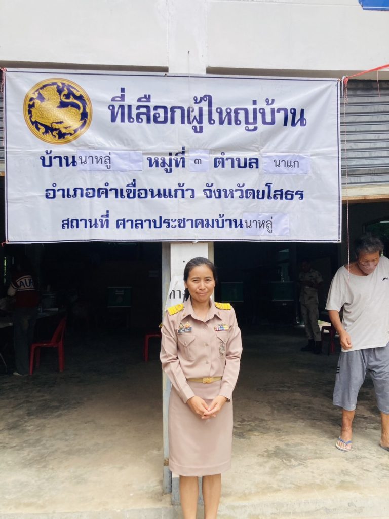วันที่ 22 พฤษภาคม 2568 นายสุชาติ ปกป้อง เกษตรอำเภอคำเขื่อนแก้ว มอบหมายให้ นางสาวณัฐธีรยา คณะบุตร นักวิชาการส่งเสริมการเกษตรชำนาญการ ปฏิบัติหน้าที่เป็นคณะกรรมการเลือกผู้ใหญ่บ้าน บ้านนาหลู่ หมู่ 3 ตำบลนาแก เปิดลงคะแนนเวลา 8.00 น. ปิดการลงคะแนน 15.00 น. ผลปฏิบัติงานเป็นไปด้วยความเรียบร้อย ณ ศาลาประชาคมบ้านนาหลู่ หมู่ 3 ตำบลนาแก อำเภอคำเขื่อนแก้ว จังหวัดยโสธร