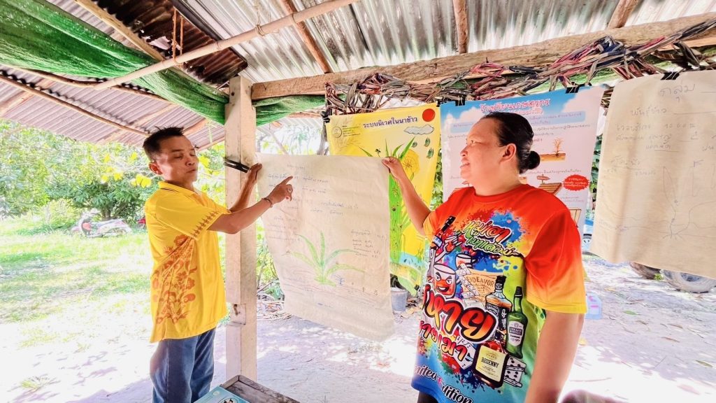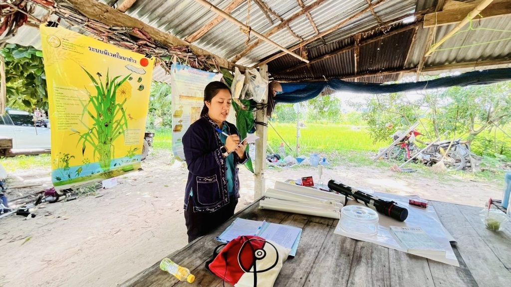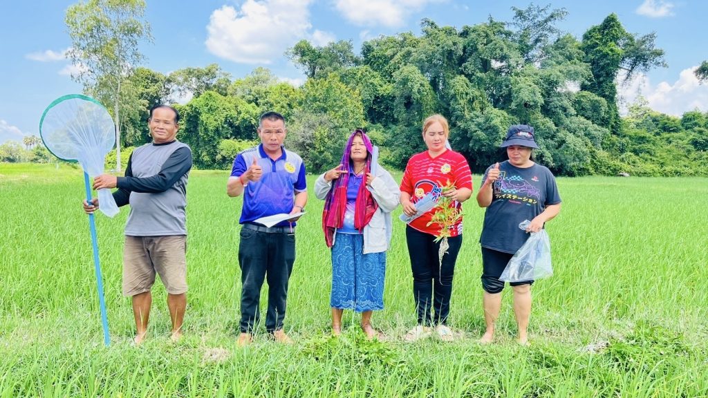 วันที่ 8 สิงหาคม 2568 นายสุชาติ ปกป้อง เกษตรอำเภอคำเขื่อนแก้ว มอบหมายให้ นางสาวณัฐธีรยา คณะบุตร และ นางสาวนันท์มนัส บุนทรีรัตน์ นักวิชาการส่งเสริมการเกษตรชำนาญการ ดำเนินการฝึกอบรมเกษตรกร โครงการระบบส่งเสริมการเกษตรแบบแปลงใหญ่ กิจกรรม ส่งเสริมกลุ่มชาวนาผู้บริหารจัดการศัตรูข้าว กิจกรรมย่อย จัดกระบวนการเรียนรู้การบริหารจัดการศัตรูข้าวตามกระบวนโรงเรียนเกษตรกร ในประเด็น ลงแปลงสำรวจระบบระบบนิเวศเกษตรในนาข้าว (AESA) นำเสนอผลการสำรวจระบบนิเวศในนาข้าว ศัตรูข้าวระยะแตกกอถึงระยะตั้งท้อง การตัดพันธุ์ข้าวปนเพื่อใช้ทำพันธุ์ และเทคนิควิธีการผลิตน้ำหมักและสารไล่แมลง เกษตรกรเป้าหมาย 10 ราย ณ ศาลาประชาคม หมู่ 4 ตำบลทุ่งมน อำเภอคำเขื่อนแก้ว จังหวัดยโสธร