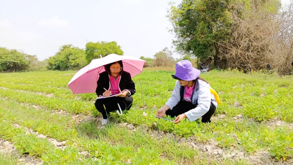วันที่ 4 มีนาคม 2568 นายสุชาติ ปกป้อง เกษตรอำเภอคำเขื่อนแก้ว มอบหมายให้ นางลักขณา นิลาลาด นักวิชาการส่งเสริมการเกษตรชำนาญการพิเศษ และนางสาวสุธิษา สิมมา นักวิชาส่งเสริมการเกษตรชำนาญการ ติดตามเก็บข้อมูลการเจริญเติบโตของถั่วลิสง พันธุ์เกษตรศาสาตร์ สวก. 1 พร้อมทั้งให้คำแนะนำการดูแลแปลงผลิตถั่วลิสง การป้องกันกำจัดโรคและแมลงศัตรูพืช แก่เกษตรกรต้นแบบการปลูกถั่วลิสง ภายใต้โครงการวิจัยการเกษตร เรื่อง ยกระดับชุมชนสู่การผลิตเมล็ดพันธุ์ถั่วลิสงเกษตรศาสตร์ สวก. 1 ในพื้นที่ภาคตะวันออกเฉียงเหนือ ณ หมู่ที่ 6,11 บ้านนาเวียง ตำบลกู่จาน อำเภอคำเขื่อนแก้ว จังหวัดยโสธร