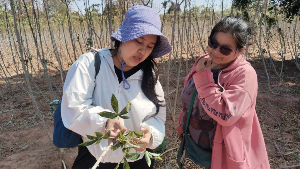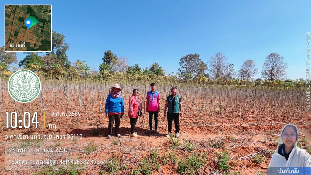 วันที่ 19 กุมภาพันธ์ พ.ศ. 2569 นางลักขณา นิลาลาด นักวิชาการส่งเสริมการเกษตรชำนาญการพิเศษ รักษาราชการแทน เกษตรอำเภอคำเขื่อนแก้ว มอบหมายให้ นายศอรทิน ทิศทะษะ นักวิชาการส่งเสริมการเกษตร และ นางสาวนันท์มนัส บุนทรีรัตน์ นักวิชาการส่งเสริมการเกษตรชำนาญการ ตรวจแปลงมันสำปะหลังเพื่อออกใบอนุญาตขนย้ายท่อนพันธุ์ เพื่อป้องกันการแพร่ระบาดของโรคใบด่าง เน้นย้ำตรวจสอบคุณภาพท่อนพันธุ์ปลอดโรค 100% ก่อนการขนย้าย ตามมาตรการควบคุมเข้มงวดของภาครัฐ เพื่อความปลอดภัยของผลผลิตและลดต้นทุนเกษตรกร ณ บ้านแหล่งหนู หมู่ที่ 6 ตำบลดงเจริญ อำเภอคำเขื่อนแก้ว จังหวัดยโสธร