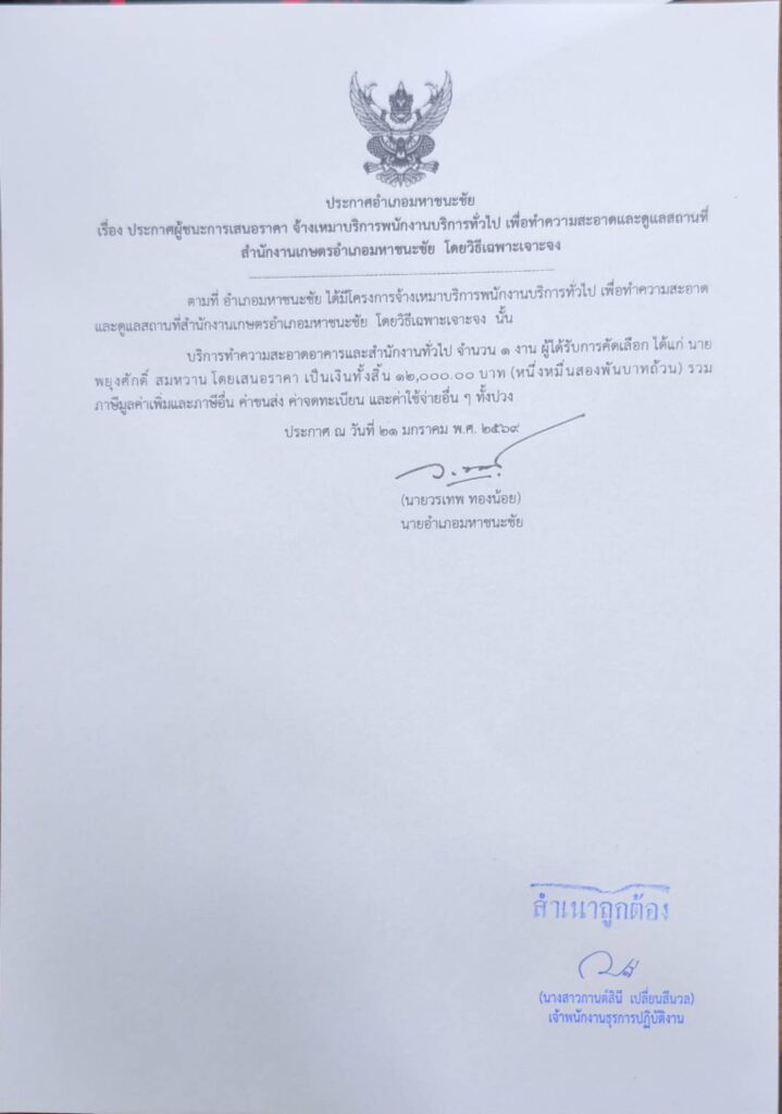 ประกาศผู้ชนะการเสนอราคา จ้างเหมาบริการพนักงงานบริการทั่วไป เพื่อทำความสะอาดและดูแลสถานที่ (กุมภาพันธ์ – มีนาคม 2569)