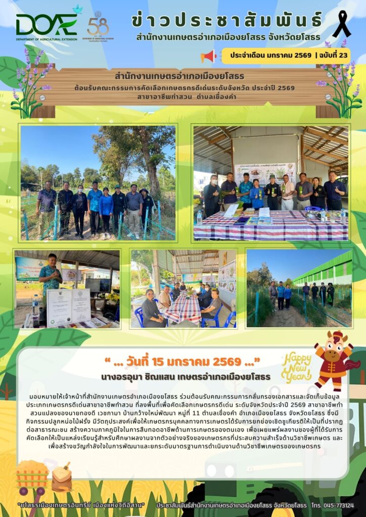 นางอรอุมา ชิณแสน เกษตรอำเภอเมืองยโสธร มอบหมายให้เจ้าหน้าที่สำนักงานเกษตรอำเภอเมืองยโสธร ร่วมต้อนรับคณะกรรมการกลั่นกรองเอกสารและจัดเก็บข้อมูล ประเภทเกษตรกรดีเด่นสาขาอาชีพทำสวน ที่ลงพื้นที่เพื่อคัดเลือกเกษตรกรดีเด่น ระดับจังหวัดประจำปี 2569 สาขาอาชีพทำสวนแปลงของนายทองดี เวชกามา บ้านกว้างใหม่พัฒนา หมู่ที่ 11 ตำบลเขื่องคำ อำเภอเมืองยโสธร จังหวัดยโสธร ซึ่งมีกิจกรรมปลูกหน่อไม้ฝรั่ง มีวัตถุประสงค์เพื่อให้เกษตรกรบุคคลทางการเกษตรได้รับการยกย่องเชิดชูเกียรติให้เป็นที่ปรากฏต่อสาธารณะชน สร้างความภาคภูมิใจในการสืบทอดอาชีพด้านการเกษตรของตนเอง เพื่อเผยแพร่ผลงานของผู้ที่ได้รับการคัดเลือกให้เป็นแหล่งเรียนรู้สำหรับศึกษาผลงานจากตัวอย่างจริงของเกษตรกรที่ประสบความสำเร็จด้านวิชาชีพเกษตร และเพื่อสร้างขวัญกำลังใจในการพัฒนาและยกระดับมาตรฐานการดำเนินงานด้านวิชาชีพเกษตรของเกษตรกร