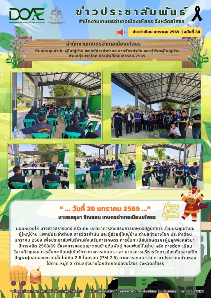 นางอรอุมา ชิณแสน เกษตรอำเภอเมืองยโสธร มอบหมายให้ นางสาวสรารินทร์ ศรีวิเศษ นักวิชาการส่งเสริมการเกษตรปฏิบัติการ ร่วมประชุมกำนัน ผู้ใหญ่บ้าน แพทย์ประจำตำบล สารวัตรกำนัน และผู้ช่วยผู้ใหญ่บ้าน ตำบลทุ่งนางโอก ประจำเดือนมกราคม 2569 เพื่อประชาสัมพันธ์งานส่งเสริมการเกษตร การขึ้นทะเบียนเกษตรกรผู้ปลูกพืชหลังนา ปีการผลิต 2568/69 ชี้แจงการขออนุญาตขนย้ายต้นพันธุ์ ท่อนพันธุ์มันสำปะหลัง การต่อทะเบียนวิสาหกิจชุมชน การขึ้นทะเบียนผู้ให้บริการทางการเกษตร และ มาตรการบริหารจัดการป้องกันและแก้ไขปัญหาฝุ่นละอองขนาดเล็กไม่เกิน 2.5 ไมครอน (PM 2.5) ภาคการเกษตร ณ ศาลาประชาคมบ้านหองไม้ตาย หมู่ที่ 2 ตำบลทุ่งนางโอกอำเภอเมืองยโสธร จังหวัดยโสธร