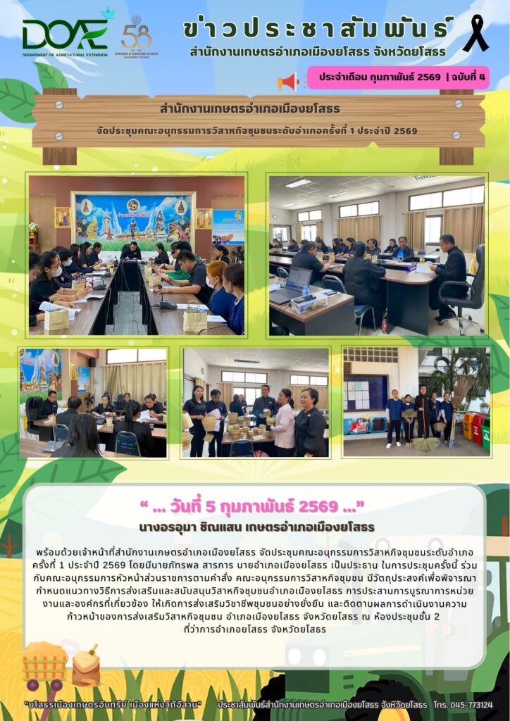 นางอรอุมา ชิณแสน เกษตรอำเภอเมืองยโสธร พร้อมด้วยเจ้าหน้าที่สำนักงานเกษตรอำเภอเมืองยโสธร จัดประชุมคณะอนุกรรมการวิสาหกิจชุมชนระดับอำเภอครั้งที่ 1 ประจำปี 2569 โดยมีนายภัทรพล สารการ นายอำเภอเมืองยโสธร เป็นประธาน ในการประชุมครั้งนี้ ร่วมกับคณะอนุกรรมการหัวหน้าส่วนราชการตามคำสั่ง คณะอนุกรรมการวิสาหกิจชุมชน มีวัตถุประสงค์เพื่อพิจารณากำหนดแนวทางวิธีการส่งเสริมและสนับสนุนวิสาหกิจชุมชนอำเภอเมืองยโสธร การประสานการบูรณาการหน่วยงานและองค์กรที่เกี่ยวข้อง ให้เกิดการส่งเสริมวิชาชีพชุมชนอย่างยั่งยืน และติดตามผลการดำเนินงานความก้าวหน้าของการส่งเสริมวิสาหกิจชุมชน อำเภอเมืองยโสธร จังหวัดยโสธร ณ ห้องประชุมชั้น2 ที่ว่าการอำเภอยโสธร จังหวัดยโสธร